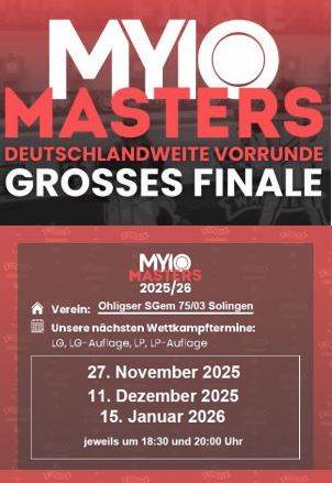 Die Ohligser Schützengemeinschaft ist Ausrichter bei den MY10 MASTERS 2025/2026. Die deutschlandweite Vorrunde macht am 27. November 2025, 11. Dezember 2025 und 15. Januar 2026 Station in Solingen. Meldet Euch gerne an. [mehr] |