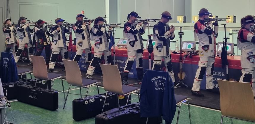 Am letzten Wettkampf des Tages ging es gegen Gastgeber SV Hubertus Steinbach. Die Steinacher Fans sorgten im vollbesetzten Dorfgemeinschaftshaus (DGH) für eine laute Stimmung. Nike Fischer auf Position 1 startete stark in den Wettkampf und holte sich bereits zum dritten Mal in dieser Saison das Präsent für die erste 100 im Match. Am Ende kam sie auf 396 Ringe und holte gegen Nora Lee Hofmann-Badea (394 Ringe) den ersten Einzelpunkt für Ohligs. Auch auf den Positionen zwei und drei waren die Ohligser erfolgreich. Michelle Blos gewann mit starken 399 Ringen gegen die Rumänin Adriana-Roberta Teodorescu (397 Ringe) und auch Antonia Ziegler war mit 396:390 Ringen gegen Alexander Röller erfolgreich. Somit waren die drei matchentscheidenden Einzelpunkte bereits eingefahren. Auf den hinteren beiden Positionen mussten sich Bastian Blos (389:391 Ringe gegen Svenja Neidhart) und Katja Blos (383:390 Ringe gegen Luc Dingerdißen) geschlagen geben. Durch den 3:2-Sieg erhöhte das Ohligser Team ihr Punktekonto auf 6:8 und kletterte auf den siebten Tabellenplatz. |