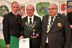 Eine Ehrung erhielt auch Michelle Blos. Bei den Europameisterschaften im norwegischen Hamar gewann die Luftgewehrschützin mit dem Juniorinnen-Team die Bronzemedaille. Am Sonntag erfuhren die Ehrungen dann ihre Fortsetzung. Auf dem „Festakt“ folgten die Ehrungen verdienter Mitglieder. Hier wurde Klaus Bruch vom Präsidenten des Deutschen Schützenbundes, Hans-Heinrich von Schönfels, für besondere Verdienste um die Deutsche Schützensache, mit dem Ehren-kreuz in Gold des DSB geehrt. Klaus war in seiner inzwischen 53jährigen Mitgliedschaft in der Ohligser Schützengemeinschaft nicht nur im Verein aktiv, sondern auch auf Bezirksebene. Als langjähriges Bezirksvorstandsmitglied durchlief er die Funktionen als stellv. Sportleiter, Referent Armbrust, Bezirkssportleiter, stellv. Vorsitzender, Geschäftsführer Finanzen und zuletzt als Bezirksvorsitzender. |