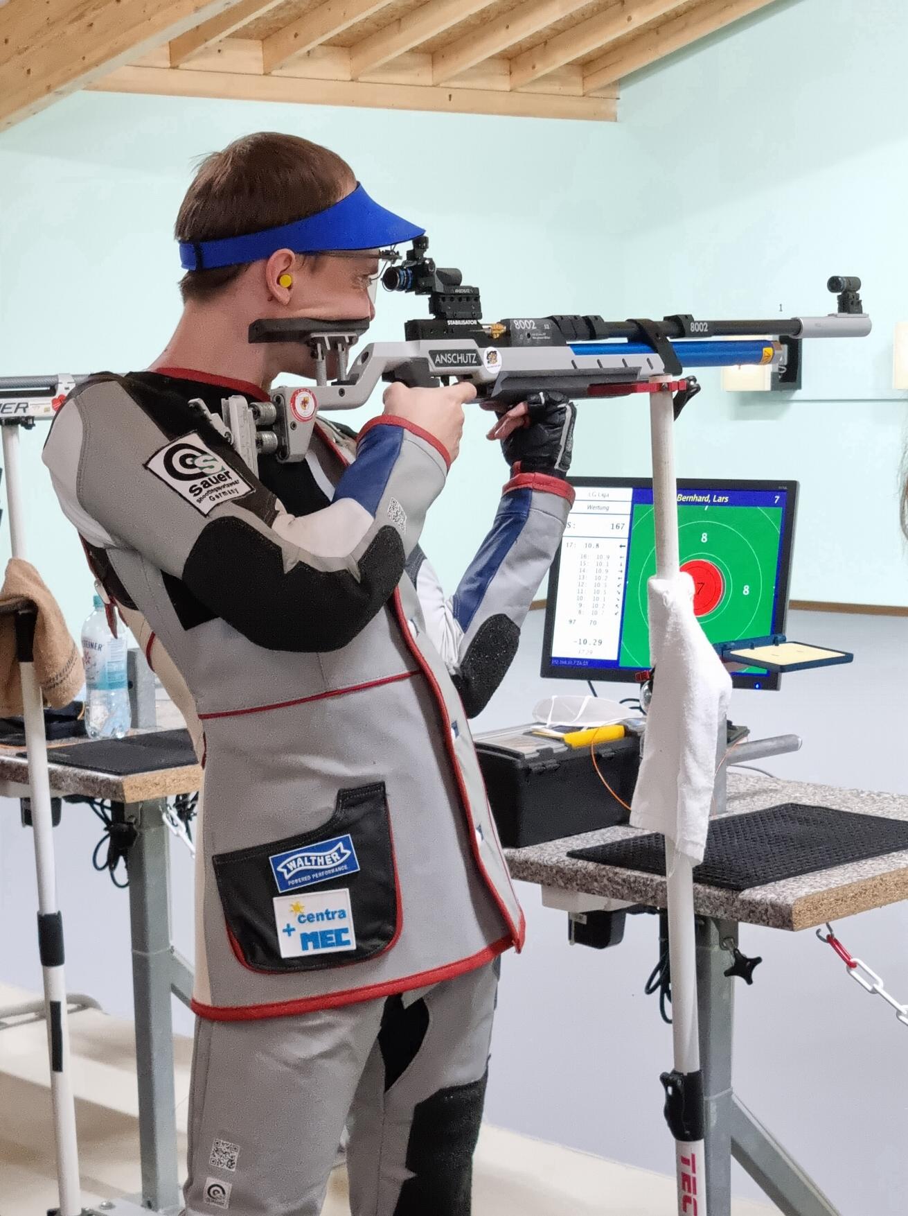 Nadine Volkart und Lars Bernhard (Foto) erzielten mit jeweils 384 Ringen noch ordentliche Ergebnisse. Während Nadine jedoch ihr Duell gegen Jan Sakowski, der furios mit neun Zehnen in Folge startete und letztendlich auf 386 Ringe kam, verlor, konnte sich Lars