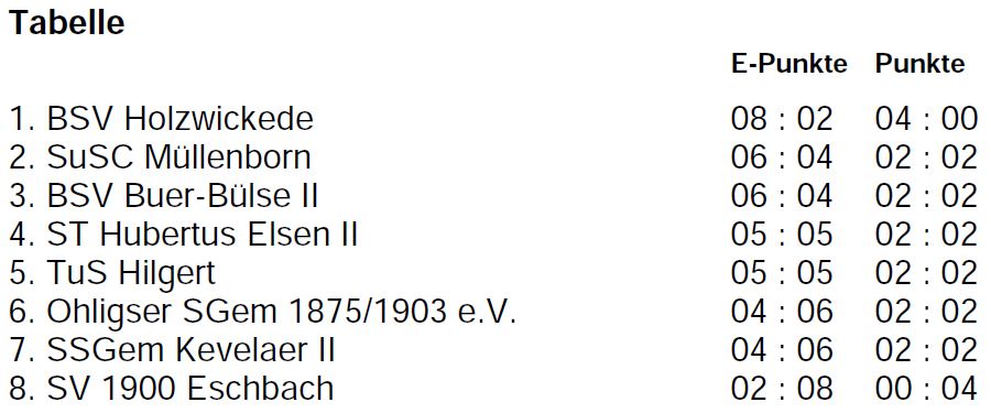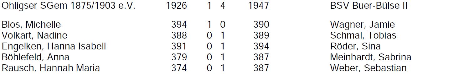 In der ersten Begegnung musste man sich mit 1:4 der Bundesligareserve des BSV Buer-Bülse geschlagen geben. Lediglich Michelle Blos an Position eins konnte sich in ihrer Paarung mit 394 zu 390 Ringen gegen amie Wagner durchsetzen und sichert ihrem Team somit den Ehrenpunkt.