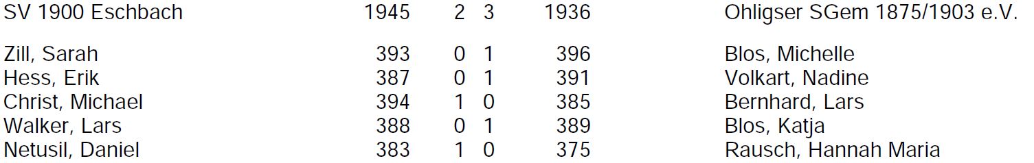Gegen Gastgeber SV Eschbach zeigte sich dann die ganze Dramatik eines Bundesligawettkampfes. Michelle Blos konnte auch hier ihre Einzelbegegnung erfolgreich abschließen und siegte gegen Sarah Zill mit 396 zu 393 Ringen. Auch Nadine Volkart behielt gegen Erik Hesse die Oberhand und holte mit 391 zu 387 Ringen den zweiten Einzelpunkt für Ohligs. Da sich Lars Bernhard und Hannah Rausch ihre Paarungen verloren, stand es zwischenzeitlich 2:2. Die Hoffnung lag somit aus Ohligser Sicht auf Katja Blos. An Position fünf hatte sich mit 389 Ringen ihren Wettkampf bereits beendet. Während ihr Gegenüber Lars Walker noch drei Schüsse abgeben musste. Der Eschbacher benötigte allerdings drei 10er, um zumindest