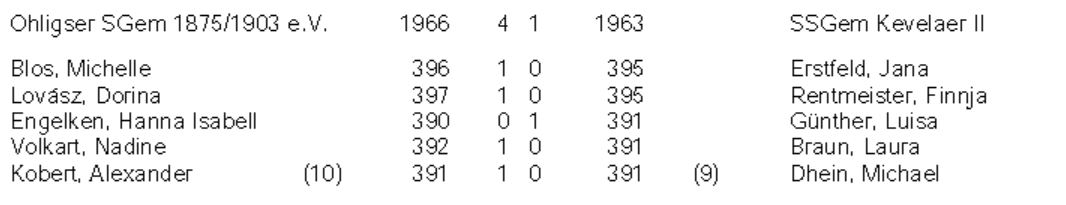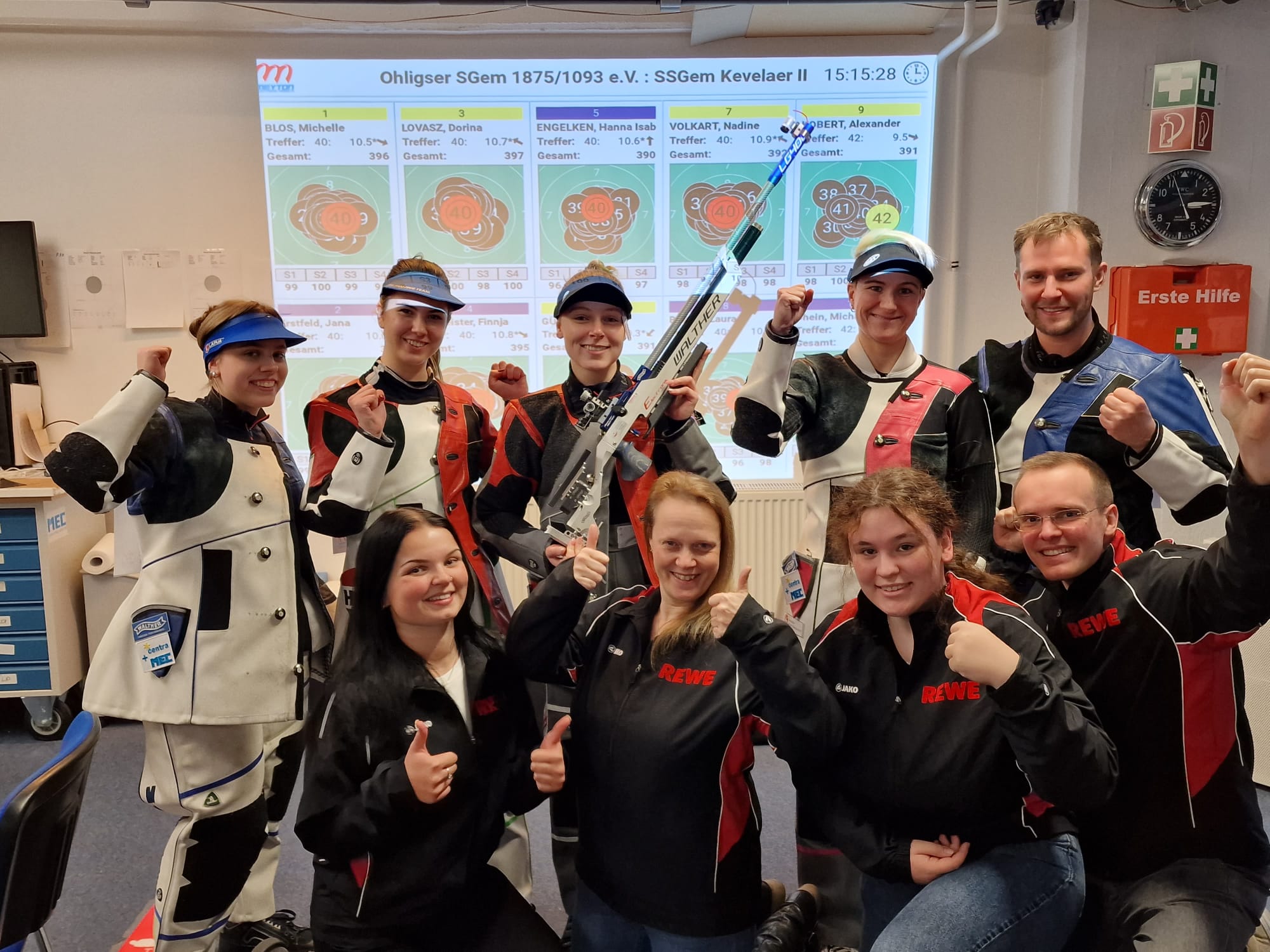 Am Nachmittag traf die Ohligser Mannschaft dann auf die Bundesligareserve der SSG Kevelaer. Auch hier hielt die Spannung bis zu den letzten Schüssen und es gab ebenfalls ein Stechen, welches allerdings keinen Einfluss mehr auf Sieg oder Niederlage hatte. Denn Michelle Blos (396 Ringe), Dorina Lovàsz (397 Ringe) und Nadine Volkart (391 Ringe) hatten bereits drei Punkte eingefahren, während Hanna Engelken (390 Ringe) ohne Punkte blieb. Nachsitzen musste dagegen Alexander Kobert, der nach seinem Fußbruch erstmals an Position fünf eingesetzt wurde. Mit 391 Ringen war er ringgleich mit seinem Kontrahenten aus Kevelaer vom Stand gegangen. Im Stechen holte Alexander dann den vierten Punkt für Ohligs und somit endete der Wettkampf mit 4:1.