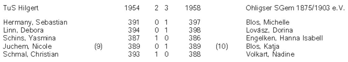Ringe. Der Mannschaftssieg musste in einem Stechen ermittelt werden. Hier zeigte Katja Blos die besseren Nerven. Die Schützen aus Hilgert drückte als erste ab und auch hier reichte es nur zu einer Neun, Katja Blos zog nach und auf dem Monitor leuchtete unter dem Jubel des Ohligser Teams der rote Punkt für die Zehn auf.
