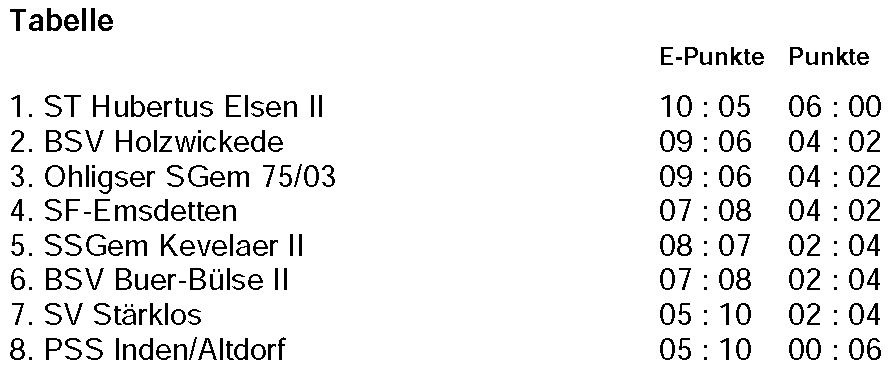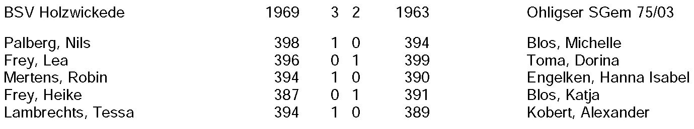 Das sogenannten „kleine“ Wettkampfwochenende führte das Ohligser Zweitligateam in die Wallfahrtsstadt Kevelaer. Dort traf man auf den BSV Holzwickede. Leider konnte Trainer Bernd Back krankheitsbedingt die Reise nicht mit antreten, wünschte dem Team aber kurz vor Beginn über Video alles Gute. Erstmals am Start war mit Dorina Toma auch der ungarische Neuzugang. In einem spannenden Match musste sich die Ohligser Mannschaft dem Gegner aus Westfalen leider mit 2:3 geschlagen geben. Die Einzelpunkte für Ohligs gewannen Katja Blos (391:387 Ringe) und die erstmals eingesetzte Ungarin Dorina Toma (399:396 Ringe). Während Michelle Blos (394:398 Ringe), Hanna Engelken (390:394 Ringe) und Alexander Kobert (389:394 Ringe) ihre Begegnungen verloren. Nach dieser Niederlage rutschte das Ohligser Team auf den dritten Tabellenplatz ab und trifft am 03.12.2023 in Dortmund auf den bislang ungeschlagenen Tabellenführer St. Hubertus Elsen II sowie auf den BSV Buer-Bülse II. |