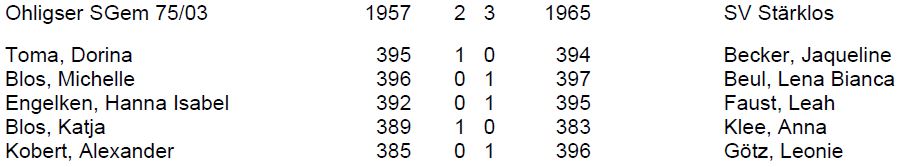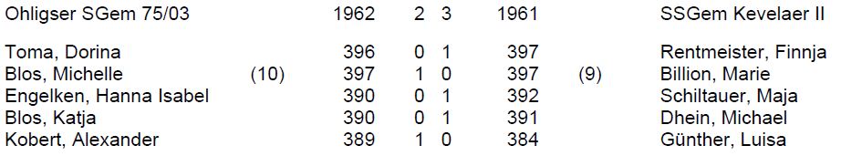 Dorina Toma (396:397), Hanna Engelken (390:392) und Katja Blos (390:391) mussten sich lediglich mit einem bzw. zwei Ringen geschlagen geben. Am Nachmittag gegen Stärklos sicherten Dorina Tomas (395:394) und Katja Blos (389:383) die Einzelpunkte für Ohligs. Michelle Blos (396:397), Hanna Engelken (392:395) und Alexander Kobert (385:396) gingen leer aus. Zum Saisonabschluss belegt das OSG-Team den zweiten Platz und nimmt somit an der Relegation zur 1. Bundesliga teil. Die Aufstiegswettkämpfe finden am 28. Januar 2024 in Hannover statt. Dort trifft man gemeinsam mit dem Zweitligameister BSV Holzwickede auf die Erstplatzierten der 2. Bundesliga Nord (SV Neuenfelde, SSV Kassenau) und der 2. Bundesliga Ost (Schützengilde zu Werder, Giebichensteiner SGi Halle) sowie auf den Bundesligaelften Team Wetterau. Die beiden erstplatzierten dieser Relegation steigen in die 1. Bundesliga Nord auf. |