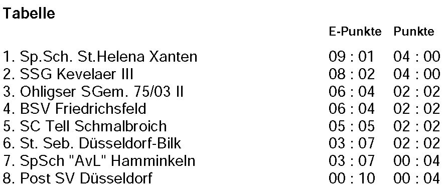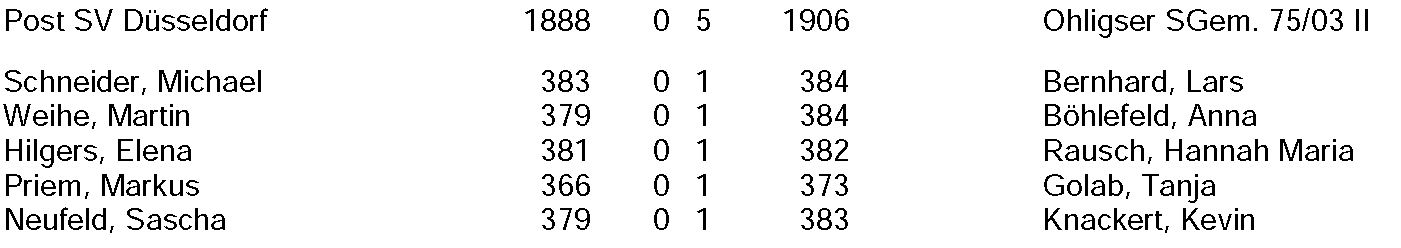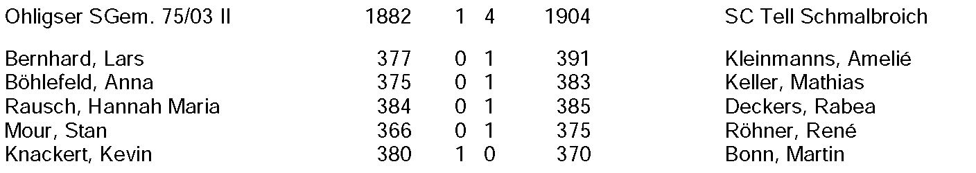Zwei Wochen nach dem Bundesligaauftakt startete nun auch die Ohligser Zweitvertretung in ihre neue Saison. Das Team schaffte nach ihrem Abstieg aus der Landes-Oberliga nach der coronabedingten Zwangspause den direkten Wiederaufstieg in die 4. Liga. Zum Saisonauftakt ging nach Düsseldorf. Dort standen die Begegnungen gegen den SC Tell Schmalbroich und dem gastgebenden Post SV Düsseldorf auf dem Programm. Im ersten Wettkampf traf man auf Schmalbroich. Dem SC Tell musste man sich noch mit 1:4 geschlagen geben Kevin Knackert (380:370 Ringe) sicherte hier den Ohligser Ehrenpunkt, während Lars Bernhard (377:391), Anna Böhlefeld (375:383), Hannah Rausch (384:385) und Stan |