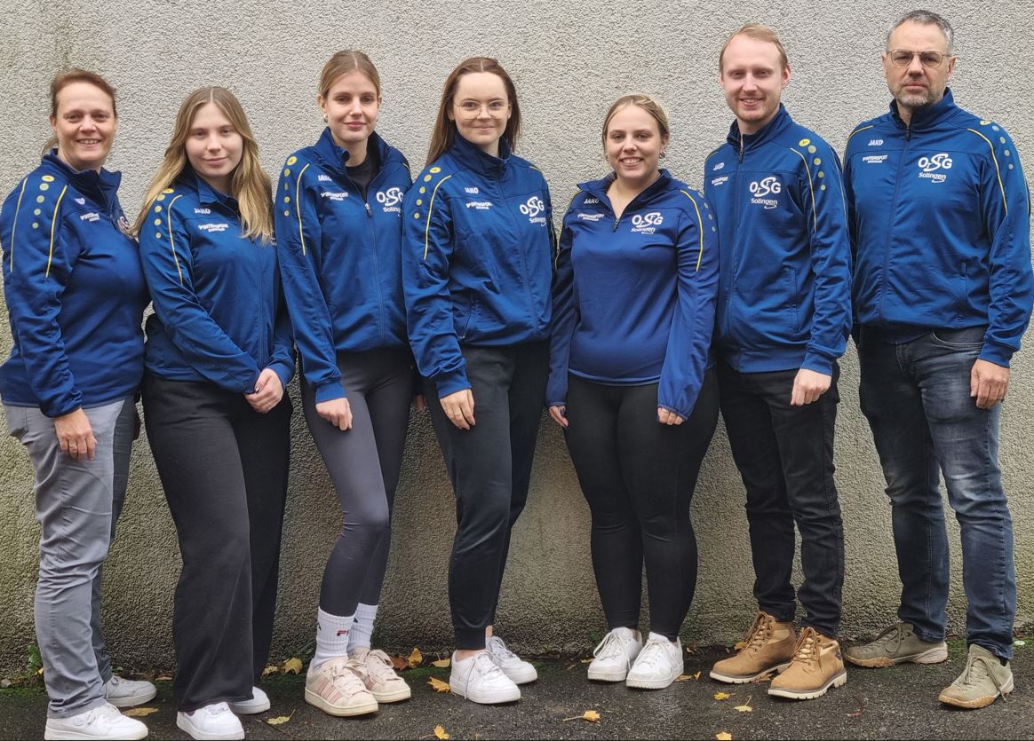 | Das Ohligser Team in Braunschweig (von links): Katja Blos, Réka Toma, Cheyenne Engelken, , Antonia Ziegler, NMichelle Blos, Bastian Blos und Trainer Bernd Back | |||||||||