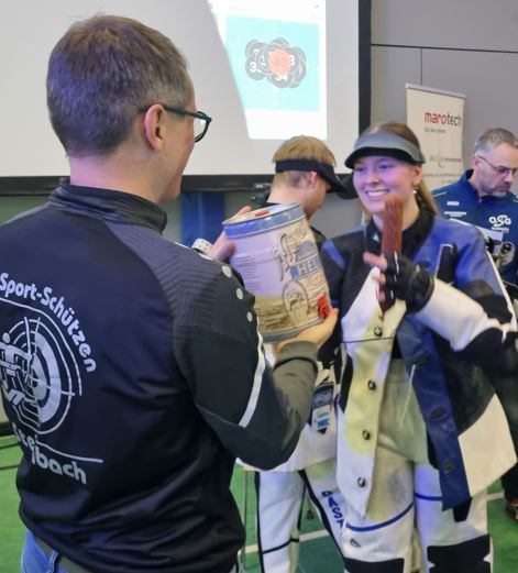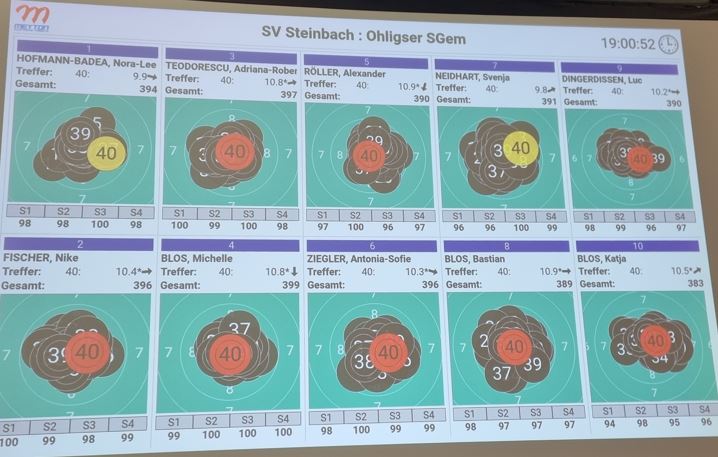 Am letzten Wettkampf des Tages ging es gegen Gastgeber SV Hubertus Steinbach. Die Steinacher Fans sorgten im vollbesetzten Dorfgemeinschaftshaus (DGH) für eine laute Stimmung. Nike Fischer auf Position 1 startete stark in den Wettkampf und holte sich bereits zum dritten Mal in dieser Saison das Präsent für die erste 100 im Match. Am Ende kam sie auf 396 Ringe und holte gegen Nora Lee Hofmann-Badea (394 Ringe) den ersten Einzelpunkt für Ohligs. Auch auf den Positionen zwei und drei waren die Ohligser erfolgreich. Michelle Blos gewann mit starken 399 Ringen gegen die Rumänin Adriana-Roberta Teodorescu (397 Ringe) und auch Antonia Ziegler war mit 396:390 Ringen gegen Alexander Röller erfolgreich. Somit waren die drei matchentscheidenden Einzelpunkte bereits eingefahren. Auf den hinteren beiden Positionen mussten sich Bastian Blos (389:391 Ringe gegen Svenja Neidhart) und Katja Blos (383:390 Ringe gegen Luc Dingerdißen) geschlagen geben. Durch den 3:2-Sieg erhöhte das Ohligser Team ihr Punktekonto auf 6:8 und kletterte auf den siebten Tabellenplatz. |
