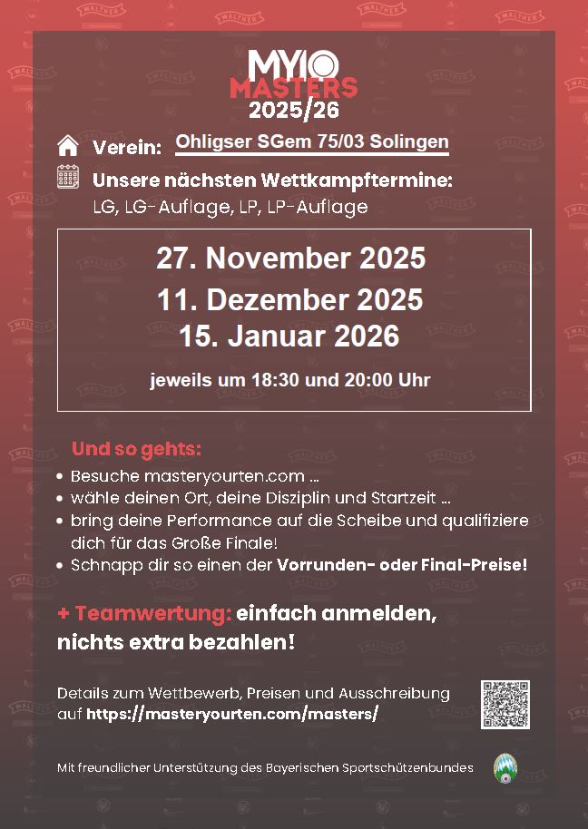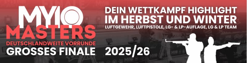 Die Ohligser Schützengemeinschaft ist Ausrichter bei den MY10 MASTERS. Bei den durch die masteryourten GMBH (Geschäftsführer sind hier David Koenders und Maximilian Dallinger) organisierten Wettkämpfen können sich Schützen*Innen in einer deutschlandweiten Vorrunde für das Finale auf der Olympiaschießanlage in München qualifizieren. An folgenden Tagen könnt Ihr Euch zur Teilnahme an den Vorrundenwettkämpfen auf unserer Schießanlage anmelden: 27. November 2025 Alle weiteren Informationen entnehmt Ihr bitte der offiziellen Ausschreibung. Die Anmeldung erfolgt Online. |