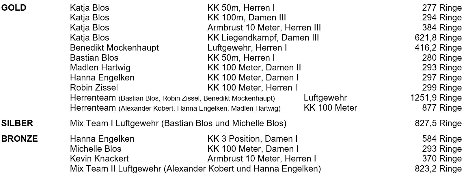 Nachfolgend eine Aufstellung der erfolgreichen Ohligser Sportschützen bei den Landesverbandsmeisterschaften: |