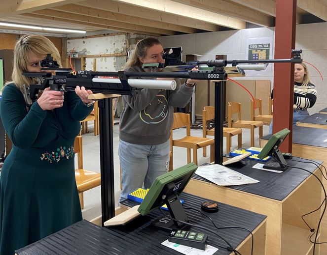 Die RSG-Moderatorinnen Clara Pieck (links) und Charlotte Großer versuchen sich im Luftgewehrschießen. |